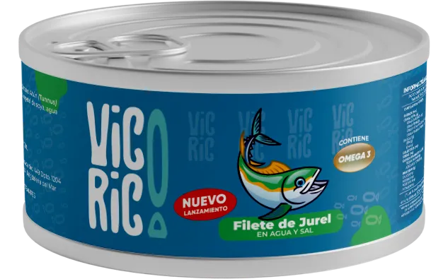 Nuestra conserva de Jurel (Trachurus murphyi) presenta filetes seleccionados de un color ligeramente cobrizo y textura compacta. Es un pescado azul de alto rendimiento energético, conservado únicamente en agua y sal marina, manteniendo su alto contenido de Omega-3 y proteínas. Presentación en caja de 48 unidades de 140 g y 170 g.
